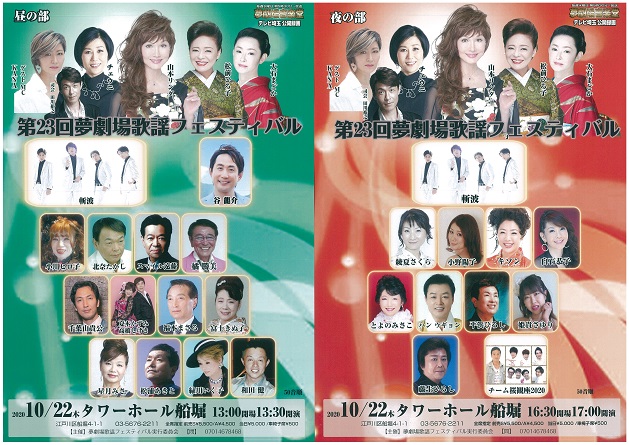 テレ玉「夢劇場音楽堂」公開録画 『第23回夢劇場歌謡フェスティバル』 会場:タワーホール船堀 (江戸川区船堀4-1-1) <昼の部>13:00開場/13:30開演 <夜の部>16:30開場/17:00開演 出演:*昼夜共に出演 山本リンダ、松前ひろ子、大石まどか、チェウニ、斬波 司会:田川裕之、ゲストMC:KANA 昼の部出演: 谷龍介、小川ヒロ子、北奈たかし、スマイル遠藤、橘勝美、千葉山貴公、 夏木和美・高橋しげき、福本まさる、富士きぬ子、星月みさ、松浦あきと、 緑川いく子、和田健 夜の部出演: 綾夏さくら、小野陽子、キソン、白石恭子、とよのみさこ、ハン ウギョン、 平浜ひろし、姫貴さゆり、藤生ひろし、チーム桜観座2020 チケット:前売りS¥5500/A¥4500 お問合せ:夢劇場歌謡フェスティバル実行委員会 070-1467-8468 |