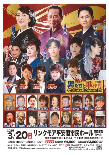 ☆レギュラー新番組☆ 《BS12公開収録》〜熱血!男たちと歌仲間〜 『ザ★ENKAていんMENと!』コンサート 会場:リンクモア平安閣市民ホール(青森市民ホール) https://aobun-sogei.com/facility/shiminhall/開場:10:30/開演:11:00 *一般歌唱発表の部有り。 チケット:S席¥4,800 自由席¥3,800 ☆レギュラー陣☆番組・縁歌メンズ(略して:縁メン) 谷龍介、金村ひろし、田川裕之 ナビゲーター:梓夕子 総合司会:西寄ひがし ☆ゲスト:桂竜士、西尾夕紀、彩青、伊達悠太、南わこ、 今千里、桜川舞子、成田美玲 ほか ほか お問い合わせ:03(5563)1545 (平日13:00〜17:00) |