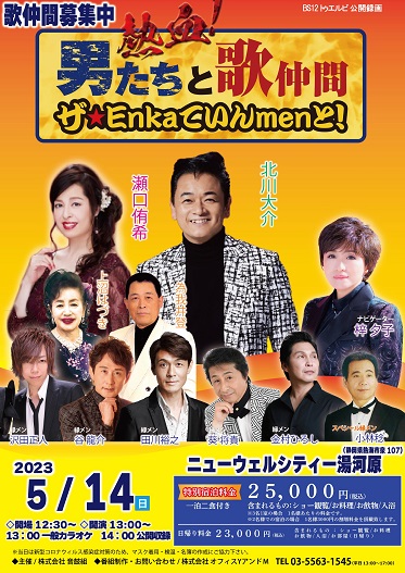 ☆レギュラー番組☆ 《BS12公開収録》 熱血!男たちと歌仲間『ザ★ENKAていんMENと!』公開収録コンサート inニューウェルシティ湯河原 ☆番組レギュラー陣☆ (縁歌メン) 谷龍介、葵将貴、沢田正人、金村ひろし、田川裕之 ナビゲーター:梓夕子 ☆ゲスト:北川大介、瀬口侑希、横浜一郎、小林稔、上沼はづき、為我井登 会場:静岡県湯河原温泉ホテル「ニューウェルシティ湯河原」(静岡県熱海市泉107) https://www.welcity-yugawara.co.jp/《開催日程》 5月14日(日) 予定時間・ショー 13:00〜/・お食事 18:00〜<別会場> ☆特別宿泊(一泊二日)料金:¥25,000− <ショー観覧、お料理、飲み物、入浴、宿泊込み> *3名1室の料金。2名1室の場合は、1名様¥3,000追加料金 日帰りプランもございます。 *お申込みお問い合わせは、 「音鼓組」03-6277-6550または、 「ヒロッキーズクラブ」まで。 |