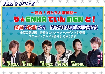 ☆レギュラー新番組☆ 《BS12公開収録》〜熱血!男たちと歌仲間〜 『ザ★ENKAていんMENと!』コンサート ☆レギュラー陣☆番組・縁歌メンズ(略して:縁メン) 谷龍介、葵将貴、沢田正人、金村ひろし、田川裕之 ナビゲーター:梓夕子 ☆ゲスト:岩本公水、一条貫太 上沼はづき・西田梨沙・為我井 登・藤森美l 会場:静岡県湯河原温泉ホテル「ニューウェルシティ湯河原」(静岡県熱海市泉107) https://www.welcity-yugawara.co.jp/《開催日程》 9月4日(日)・5日(月)2日間公演 両日とも・ショー 13:30〜/・お食事 18:00〜<別会場> ☆特別宿泊(一泊二日)料金:¥25,000− <ショー観覧、お料理、入浴、宿泊込み> *3名1室の料金。2名1室の場合は、1名様¥3,000追加料金 日帰りプランもございます。 *お申込みお問い合わせは、 「渇ケ鼓組」03-6277-6550または、 「ヒロッキーズクラブ」まで。 |